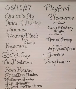 May 15, 2017 – Live music with Tim Macdonald and Jeremy Ward and special guest violinist David Douglass, co-director of the Newberry Consort. Program of dances from the Playford publications of the 17th century.